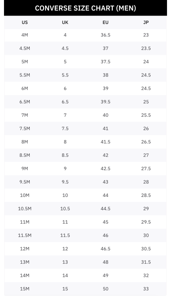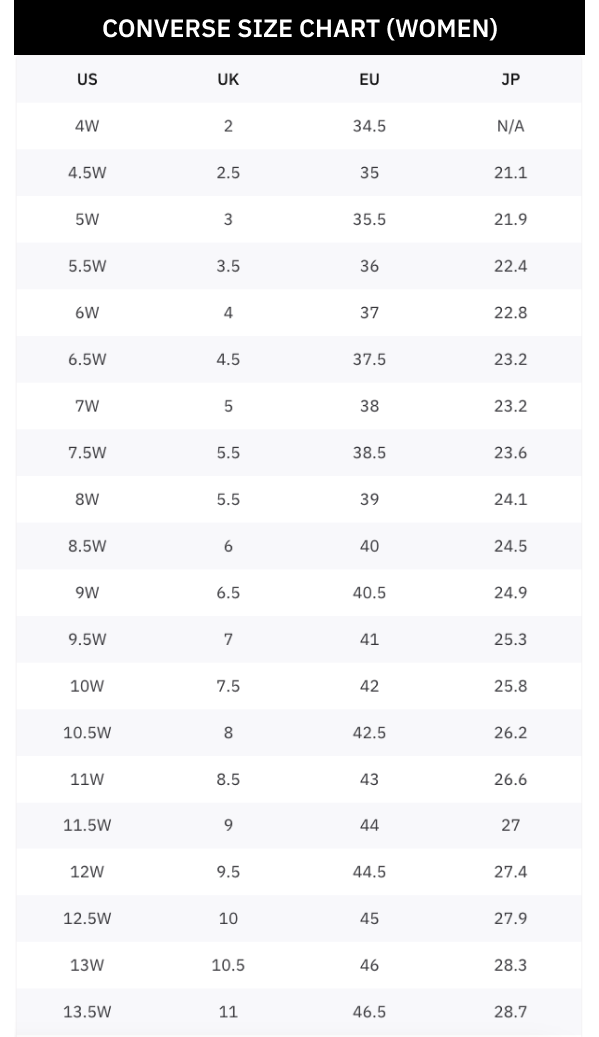- 使用 Converse 尺寸對照表找到你的專屬鞋碼!不論你是用美國(US)、英國(UK)、歐洲(EU)還是日本(JP)尺寸標示,都可以按照以下尺寸表找到最合腳的尺寸。以後買鞋不能試穿的情況下也不用再怕買錯尺寸啦!