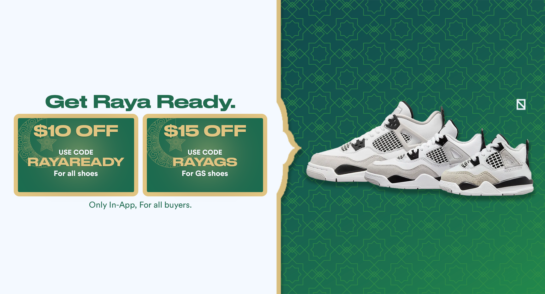 Till 24 Apr 2024, all members can get SGD$15 / RM50 off only on selected GS, TD, PS, Youth shoes in our hari-raya-gs collection through our Novelship app by using code RAYAGS for orders with SGD$150 / RM500 (This code is valid for a single use per user and is applicable only to “Buy Now” orders).