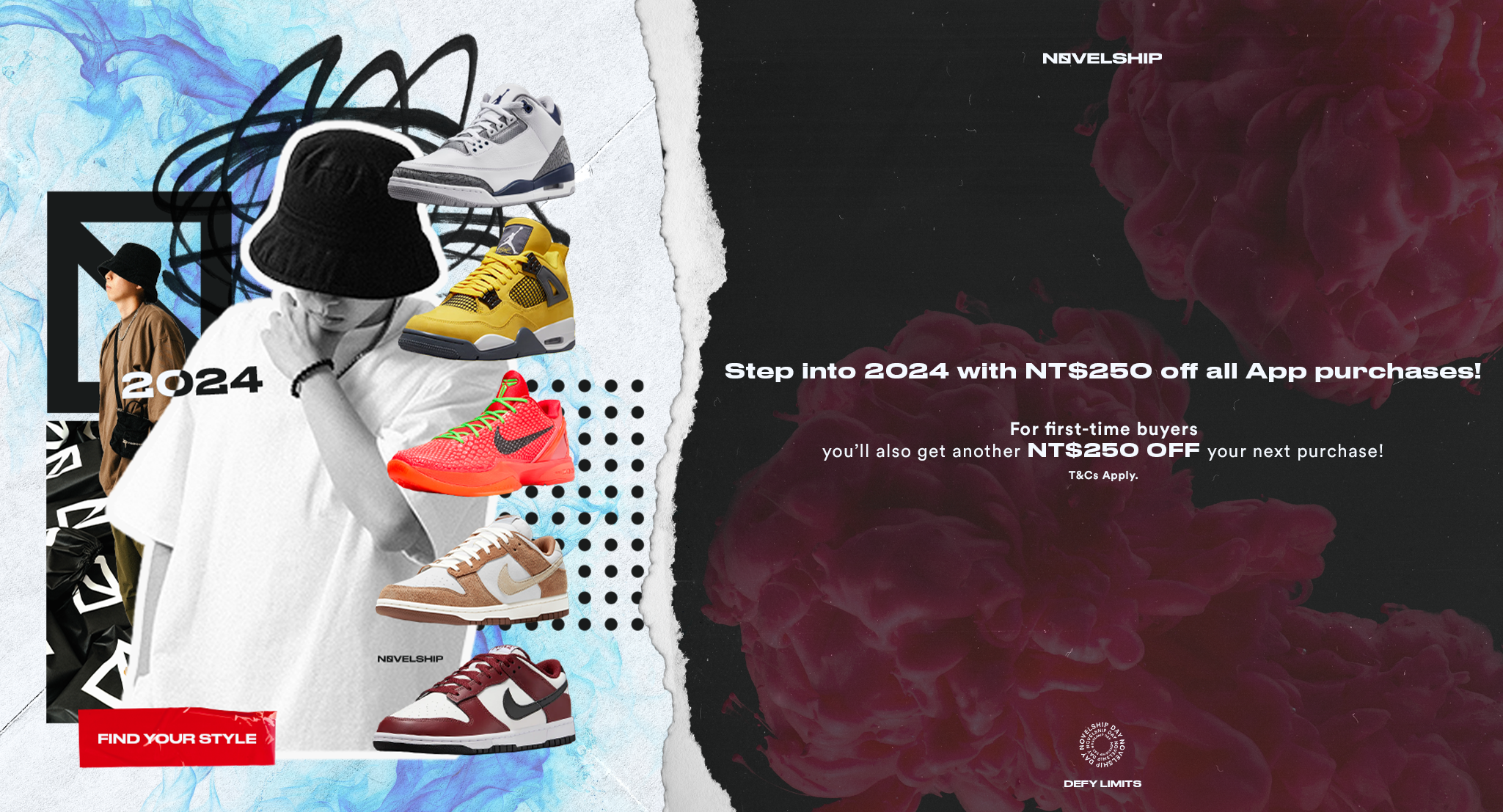 From 1 Jan – 2 Jan 2024, any first-time buyers who using code NSJAN will get an extra NT$250 off voucher in your account(The given extra voucher is only valid for “Buy Now” orders through our Novelship App until 31 Jan 2024).